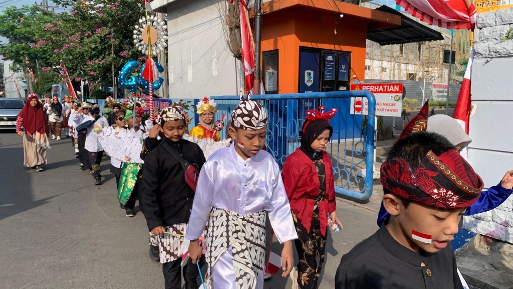 _Dengan busana adat penuh warna, siswa-siswi SD Mumtaz semarakkan pawai kemerdekaan HUT RI ke-80, menyusuri kawasan sekitar sekolah_ (Reni Hartanti/MumtazNews)