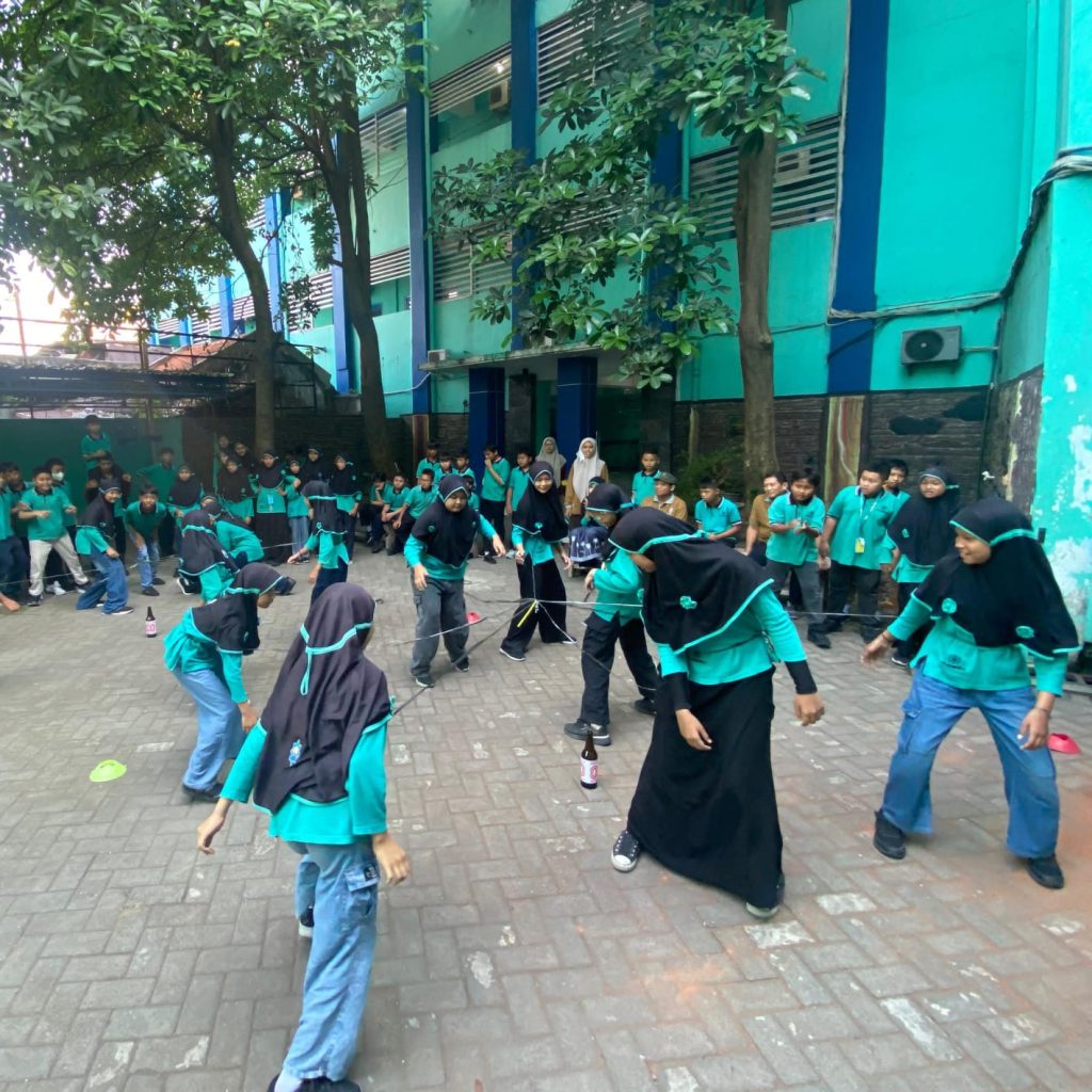 Sementara itu, lomba tarik tambang berlangsung penuh semangat. Dua kelompok siswa saling beradu kekuatan dan kekompakan. Sorakan dukungan dari teman sekelas bergema keras di sekitar lapangan, menciptakan atmosfer kompetisi yang meriah dan penuh sportivitas.