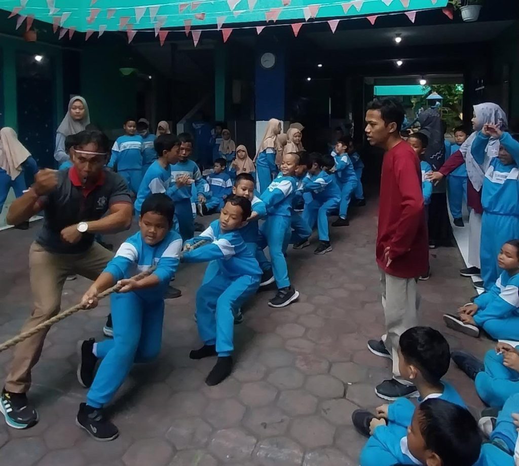 Tarik… semangat! Siswa SD Mumtaz bergembira memeriahkan HUT RI ke-80 dengan lomba tarik tambang penuh kekompakan (Reni Hartanti/MumtazNews)